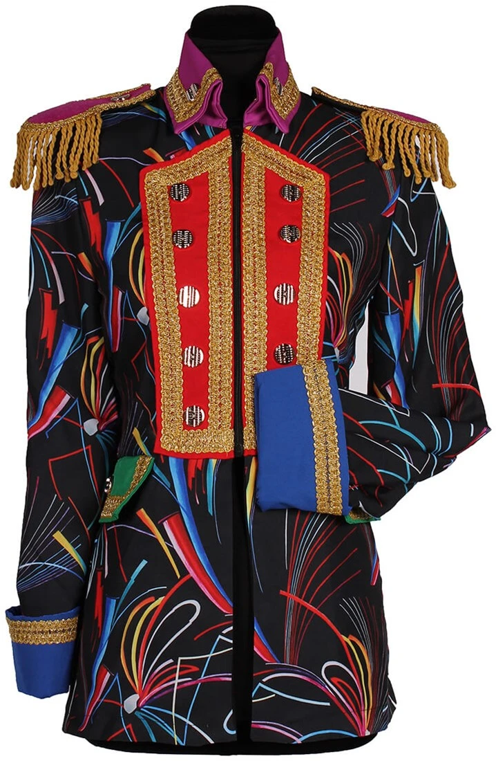 Details: afgewerkt met goudkleurig band, sierknopen en epauletten