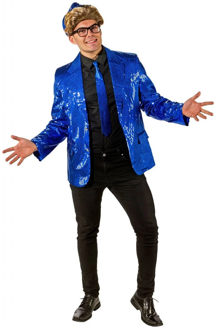 Colbert pailletten blauw, glitter en glamour jas voor heren. Met dit exclusieve jasje heeft u altijd een mooi themafeest item in uw kledingkast.
