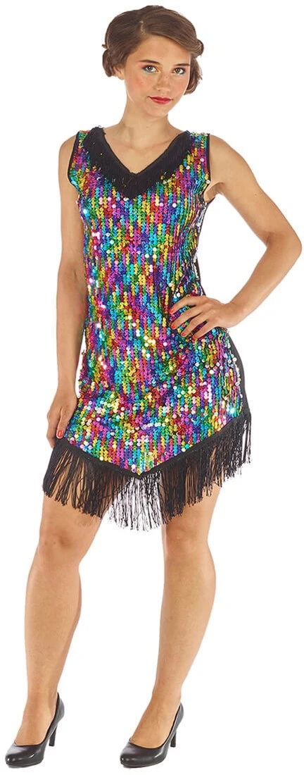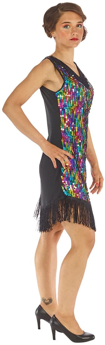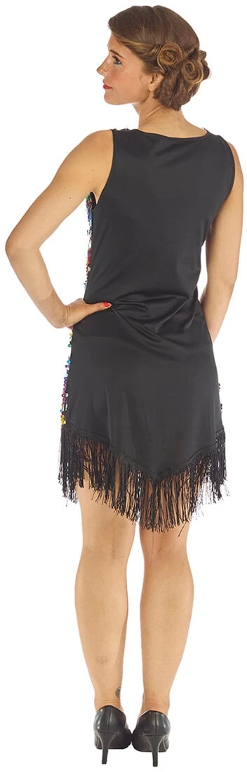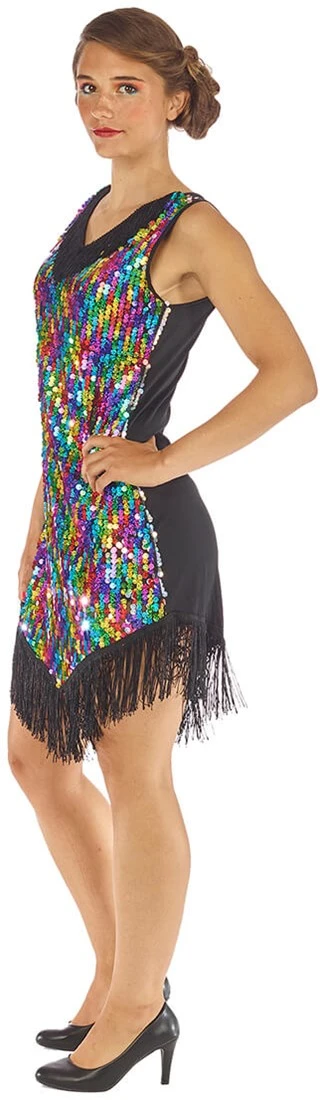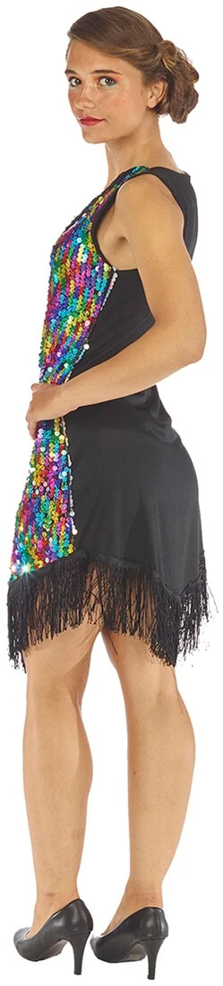 Leuke sexy pailletten damesjurk. Bij de hals en onderaan zitten franjes wat een sierlijk effect geeft aan de jurk. De glitter pailletten zijn alleen aan de voorkant van de jurk bevestigd, de achterkant is gewoon gladde stof.