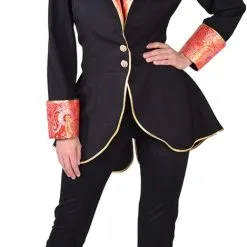 Details: de kraag en de manchetten hebben een brocante stof en de jas is afgezet met een goud band