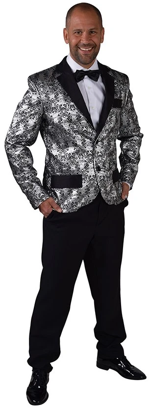 Deze colbert heeft een zwarte basis, die versierd is met een patroon van zilverkleurig brokaat. Ook verkrijgbaar met een goudkleurig motief.
