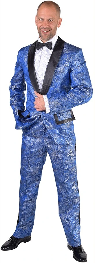 Een blauw gevoerd herenkostuum met een zilveren brokaat patroon. De colbert heeft semi-glanszwarte revers en details bij de (nep-)zakken. Het maatpak wordt geleverd inclusief de colbert en de broek. Bijpassende accessoires of overhemden zijn apart verkrijgbaar. Gemaakt van 95% polyester/brokaat en 5% metallic zilveren stof.