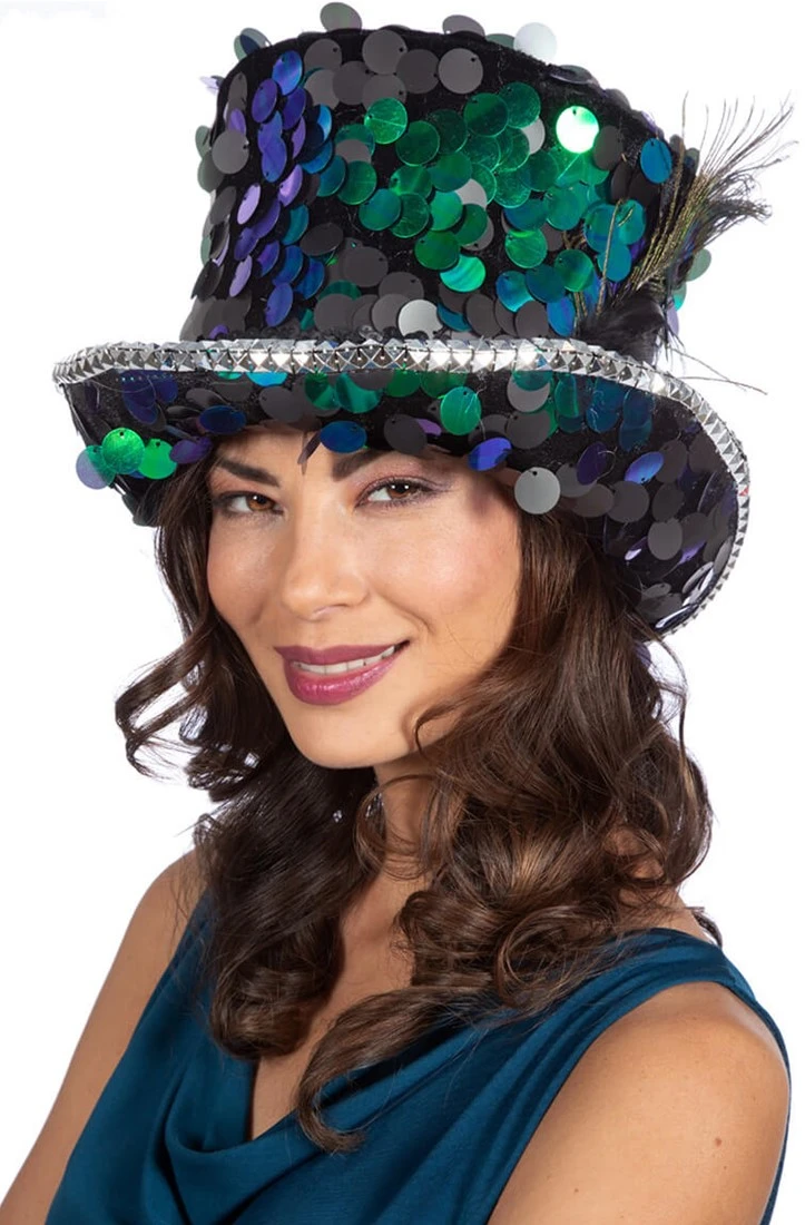 Details: grote pailletten met aan de zijkant pauwen veren, de rand van de hoed heeft zilveren studs