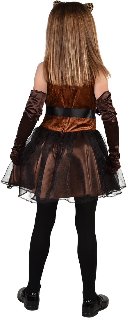 Details: tijger print bovenstuk met een bruine satijnen rok, over de rok zit een zwarte tule laag en een zwart lint om het middel