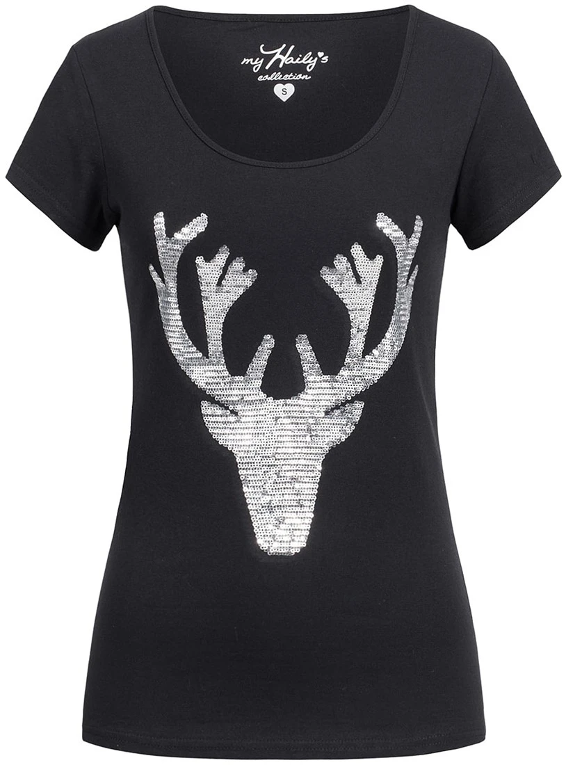 Details: aan de voorkant staat een hertenkop van zilveren pailletten